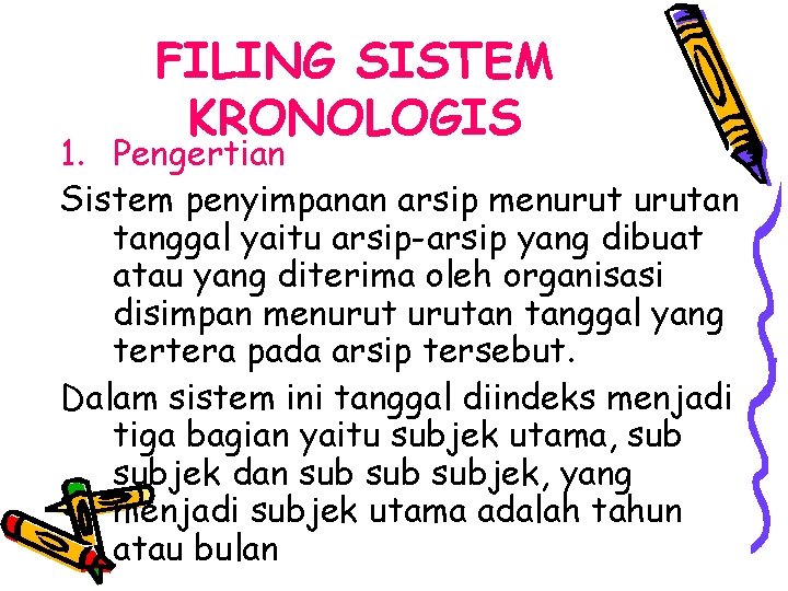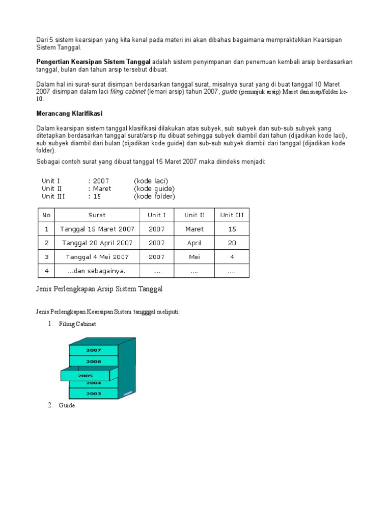Dec 19, 2012 · filing sistem tanggal adalah suatu sistem penyimpanan arsip berdasarkan tanggal, bulan, dan tahun penyimpanan arsip yang bertalian. Dalam sistem ini susunan arsip diatur berdasarkan waktu, seperti tahun, bulan, dan. Dalam sistem ini yang dijadikan kode penyimpanan dan penemuan kembali adalah tanggal, bulan atau tahun pembuatan surat atau tanggal surat yang tercantum pada barisan tanggal yang tercantum dalam arsip itu sendiri. Petunjuk pokoknya adalah tahun, kemudian bulan dan tanggal. 6 menurut anhar, system kronologis adalah suatu system kearsipan dengan menyimpan surat atau dokumen berdasarkan hari, bulan, atau tahun.