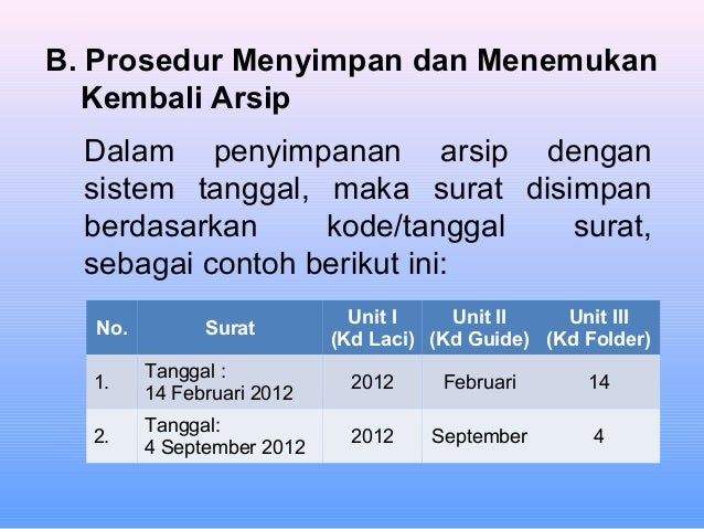Kearsipan from img.yumpu.com Dalam sistem ini susunan arsip diatur berdasarkan waktu, seperti tahun, bulan, dan. Kode surat adalah nomor yang ditetapkan oleh unit yang bersangkutan. System kronologis adalah suatu system kearsipan dengan menyimpan surat atau dokumen berdasarkan hari, bulan, atau tahun. Sistem ini merupakan sistem yang sederhana dan mudah, tetapi sistem ini seringkali menggunakan alat bantu lain (kartu indeks) untuk menemukan arsip yang dicari. Petunjuk pokoknya adalah tahun, kemudian bulan dan tanggal. Yang dijadikan dasar untuk menentukan kode folder pada kearsipan sistem tanggal adalah. Tanggal yang dijadikan kode surat tanggal pembuatan surat atau tanggal pembuatan surat atau tanggal penerimaan surat kelebihan sistem kronologis yaitu : Jul 24, 2011 · sistem kronologis filling sistem tanggal juga sering disebut sebagai sistem waktu.